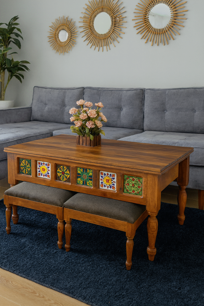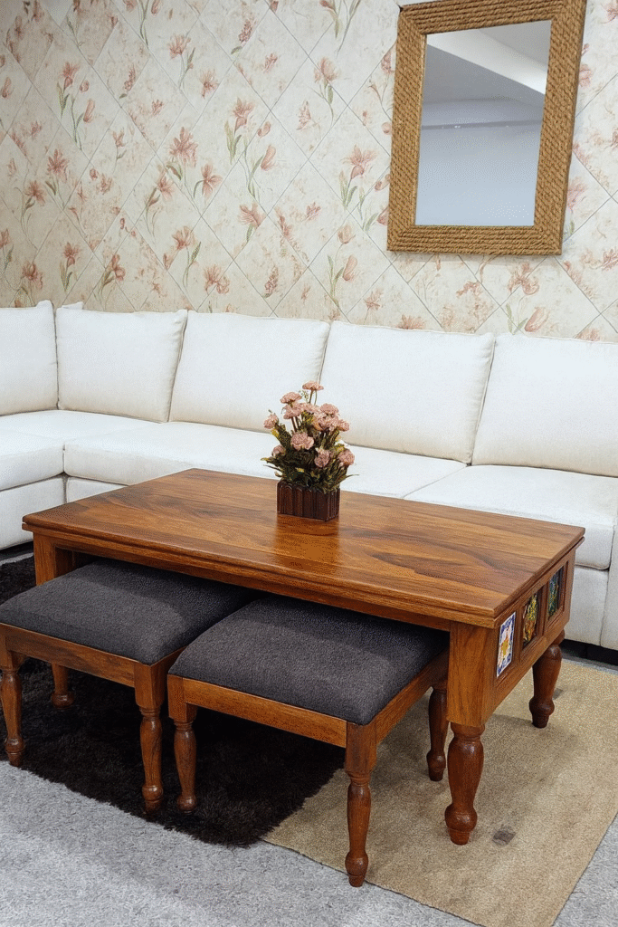 Woodkalakar ClassicNest coffee Table with 2 Cushioned Stools