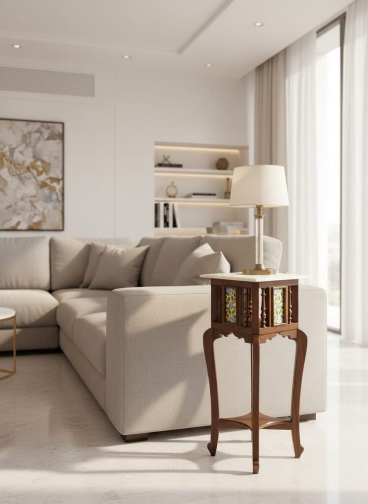 Woodkalakar Elegant Teak Wood Side Table with Marble Top