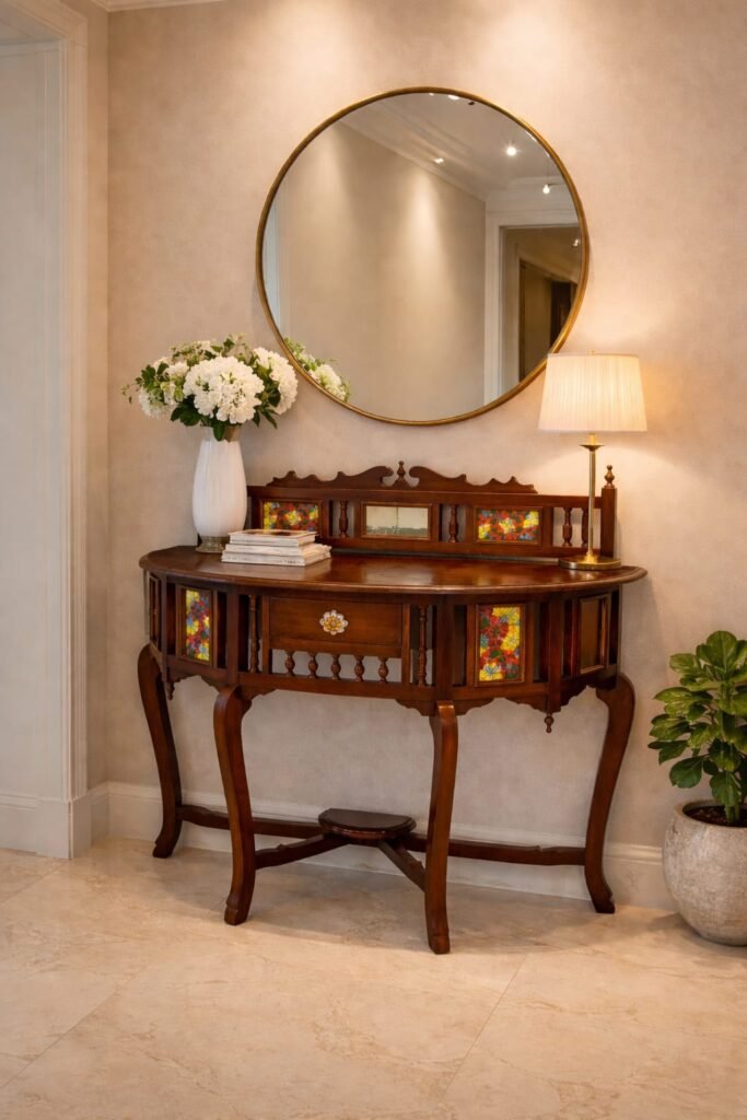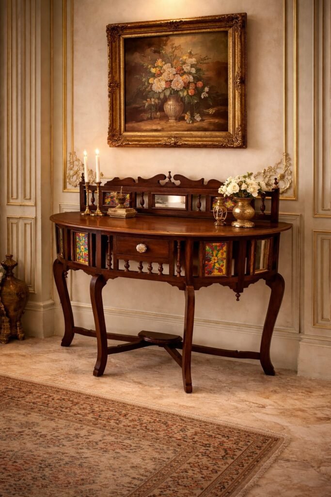 Woodkalakar Vintage Teak Wood Console Table with Marble Top | Handcrafted Entryway / Hallway Table with Drawer & Decorative Floral Glass Panels | Wooden Console Table for Living Room, Foyer & Hallway