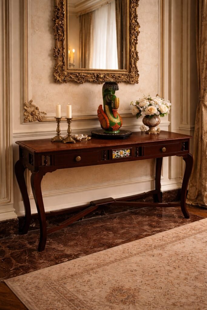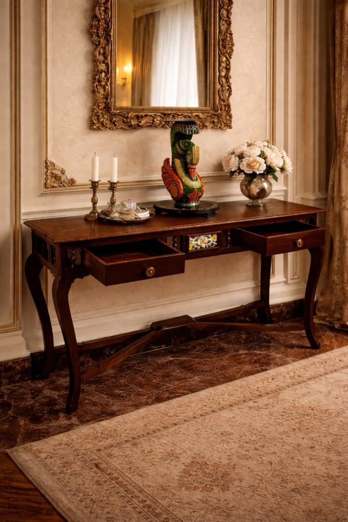 Woodkalakar Handcrafted Teak Wood Console Table with Marble Top | Vintage Entryway Hallway Table with Drawers | Solid Wooden Sofa Side Table for Living Room | Antique Style Storage Console Table