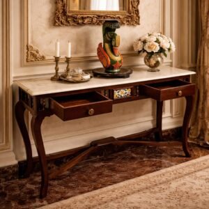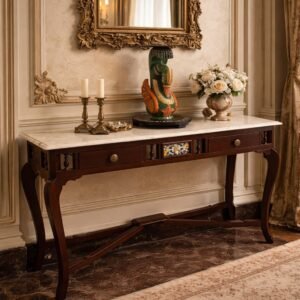 Woodkalakar Handcrafted Teak Wood Console Table with Marble Top | Vintage Entryway Hallway Table with Drawers | Solid Wooden Sofa Side Table for Living Room | Antique Style Storage Console Table