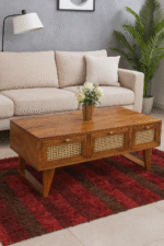 Stylish Sheesham wood coffee table with cane-front drawers and a modern leg design. A perfect blend of elegance and utility for your living room.