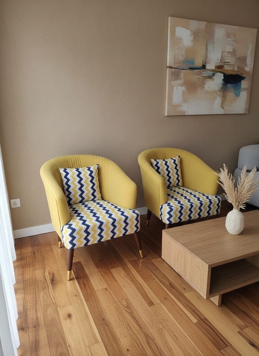 Add a pop of style to your living room with this set of 2 modern accent chairs featuring vibrant yellow upholstery and a bold zig-zag print. Designed with premium teak wood legs and a contemporary curved backrest, these chairs deliver both comfort and luxury to any space.