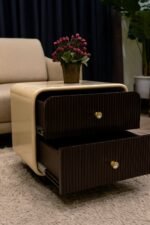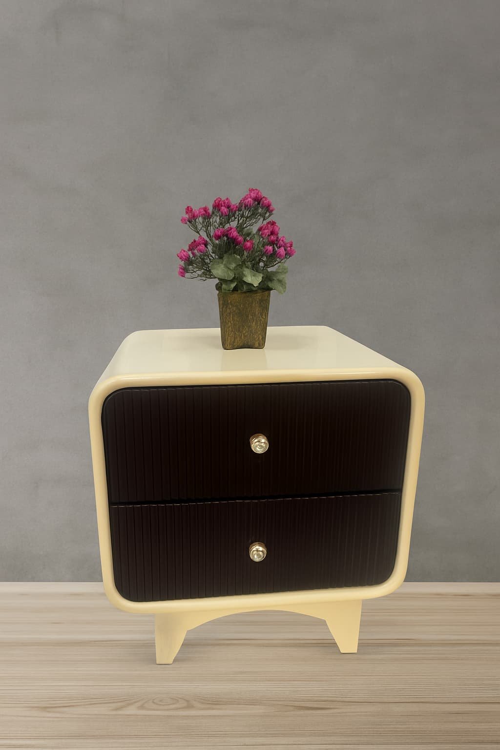 The NoirCrème Luxe Bedside Table is the epitome of bold elegance, combining a creamy gloss body with rich dark brown fluted drawers and gold crystal knobs. Made from premium plyboard and MDF with a PU polish, this piece offers both luxe appeal and functional dual-drawer storage. Color customization available.