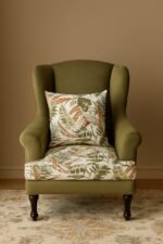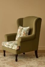 The OliveWing Lounge Chair is a perfect blend of classic elegance and modern comfort. Crafted with a sturdy solid teak wood frame, this chair features a high backrest with winged sides, upholstered in a soothing olive green fabric. The seat and matching pillow come with a tropical leaf-printed cushion, adding a refreshing and stylish vibe to your living room, lounge, or reading corner. Designed for durability and relaxation, this chair combines timeless craftsmanship with contemporary charm.