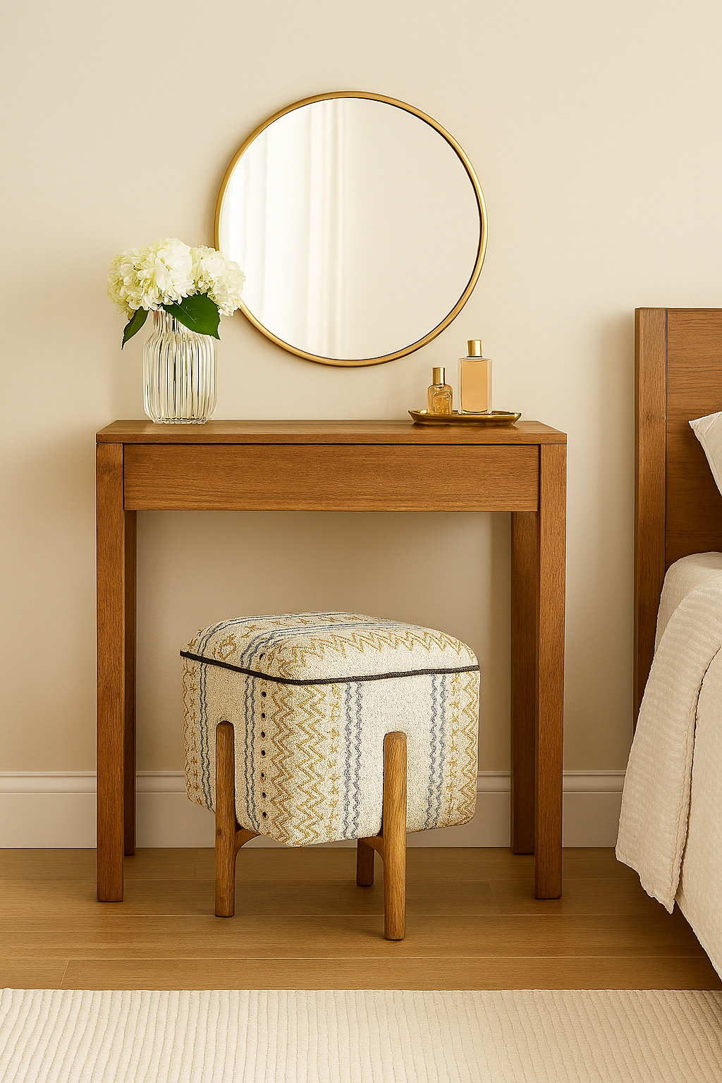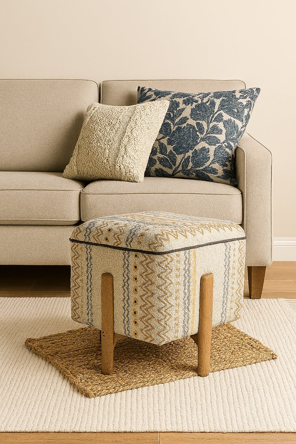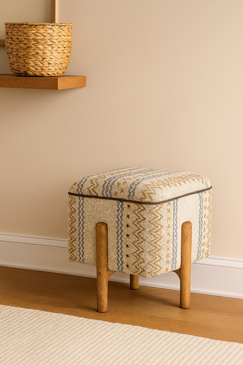 A stylish triangular stool that fits perfectly into corners, the TriNest blends utility and charm with its mango wood structure and earthy dune-patterned upholstery. A space-saving accent piece with bold aesthetics.