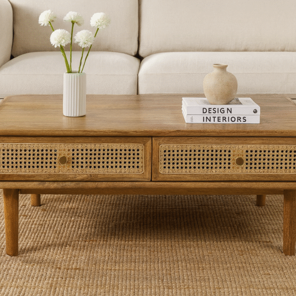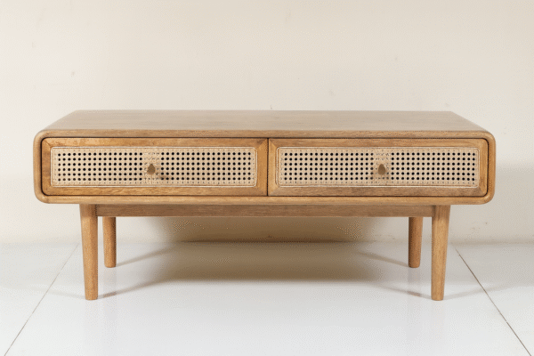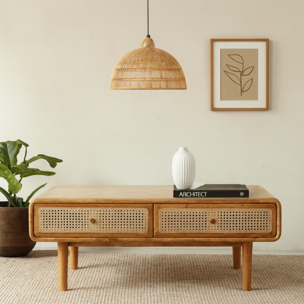 Add timeless charm and functionality to your living space with the WOODKALAKAR Mid-Century Modern Wooden Coffee Table. Expertly handcrafted, this table combines the elegance of natural wood with the earthy texture of cane detailing, creating a warm and inviting focal point for any boho-inspired or modern home.