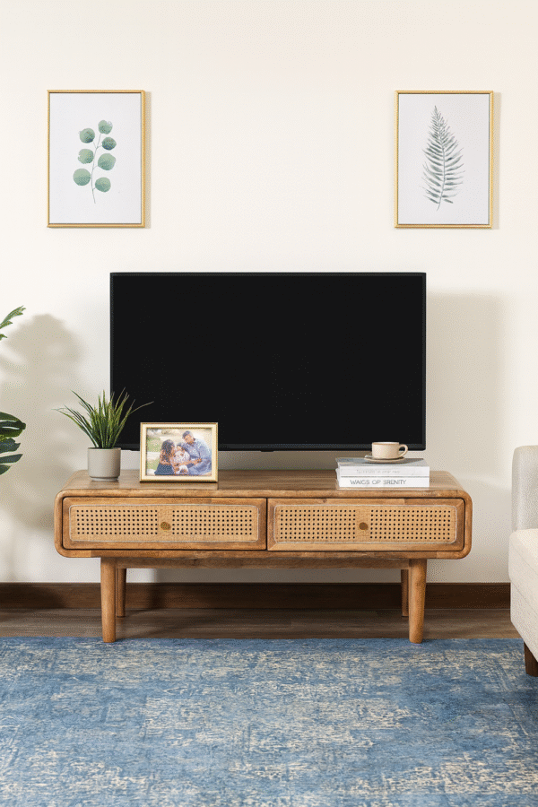 WOODKALAKAR Rustic TV stand | 2 Cane front Doors & 2 Drawers Original price was: ₹34,500.00.Current price is: ₹23,000.00.
