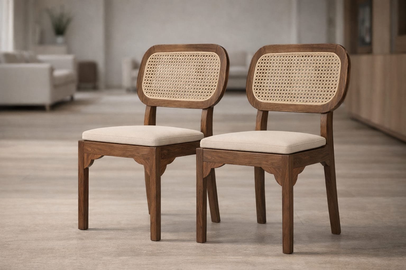 The chair features a handwoven natural cane (rattan) backrest, offering breathability and traditional charm, while the soft beige cushioned seat provides enhanced seating comfort for everyday dining or extended gatherings. Its compact yet well-balanced proportions make it ideal for dining rooms, living spaces, cafes, or boutique interiors.